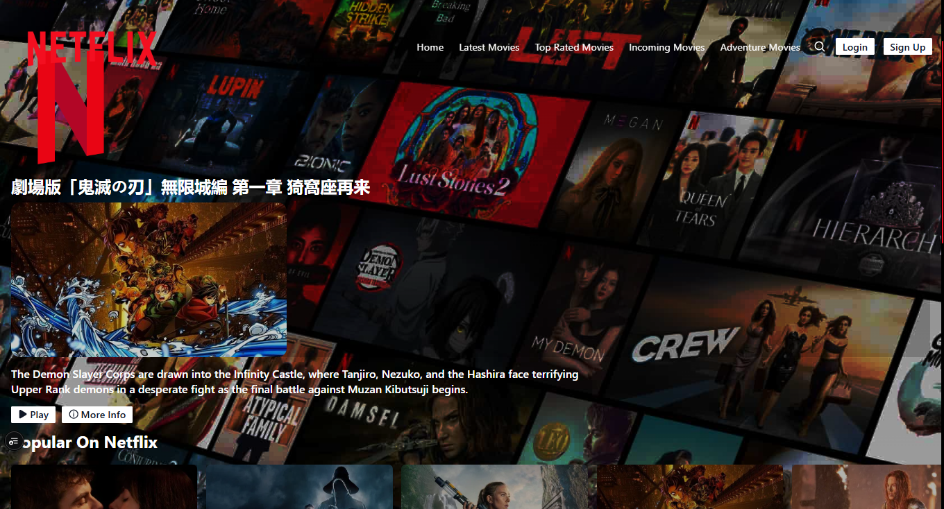 A functional replica of Netflix's interface with movies , and responsive design patterns.